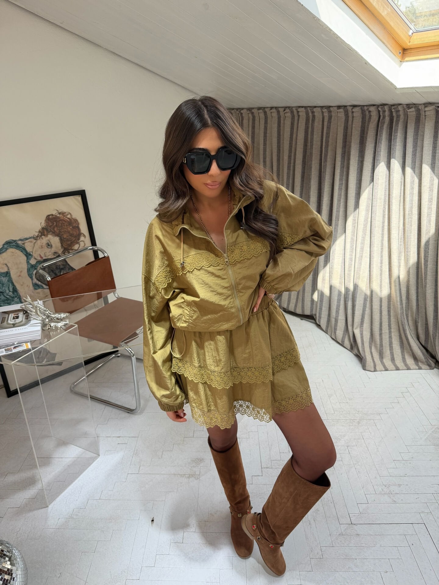 Ürün detayı: Etek beli lastikli, uzunluk 41 cm, şort astarlı / Üst ceket uzunluk 56 cm
